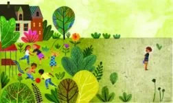Later, our group noticed another ruler on the table when the girl is eating lunch and the others are talking about her. M.D. said “the people are ruling her and she feels judged.” I loved this literal interpretation of the symbolism. With our focus on the ruler, M.M. anticipated our discussion about the body next to a tree with the ruler design and asked our group to notice it. F. said “he looks lonely too, so he has a ruler too.” I was able to share some of the behind-the-scenes inspiration from Rafael López’s son, Santiago, thanks to the Seven Important Things Before Breakfast interview. The group noticed how the contrasting colors emphasized the boy’s isolation from the other kids playing. They were drawn into the following spread where “all that stands beside you is your own brave self.”